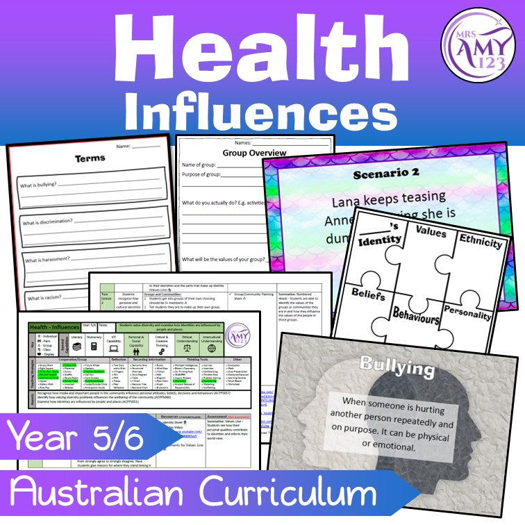 In this Year 5/6 Health unit, students explore the value of diversity, examine the factors that shape identity, and investigate how people and places influence who we are. Through thoughtful discussions, cooperative learning and reflective activities, students build the skills to understand themselves, appreciate others and contribute to inclusive communities. The unit is aligned to the Australian Curriculum Version 9, with a WA Curriculum planner also included.