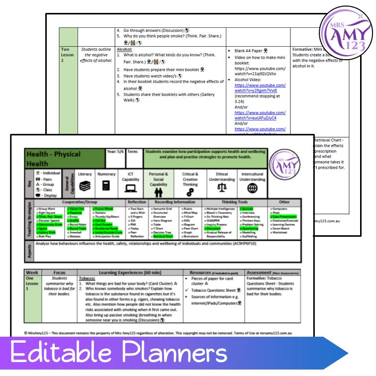 This comprehensive Year 5/6 Health and Physical Education unit includes 10 engaging, curriculum-aligned lessons where students examine how participation supports health and wellbeing, and plan and practise strategies to promote health and safety. Covering essential topics such as tobacco, alcohol, medication usage, physical activity, water safety and traffic safety, this unit is fully updated to Version 9 of the Australian Curriculum and designed to build confident, informed decision-makers.